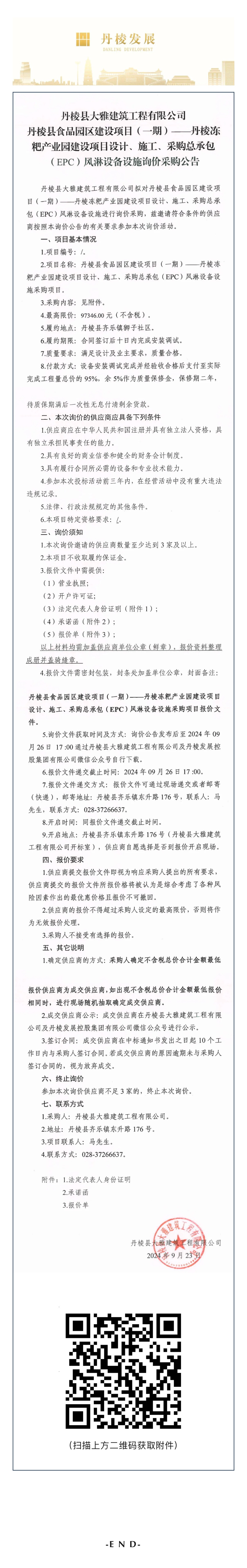 縣大雅建筑公司丹棱縣食品園區(qū)建設(shè)項(xiàng)目(一期)—丹棱凍粑產(chǎn)業(yè)園建設(shè)項(xiàng)目設(shè)計(jì)、施工、采購(gòu)總承包(EPC)風(fēng)淋設(shè)備設(shè)施詢價(jià)采購(gòu)公告