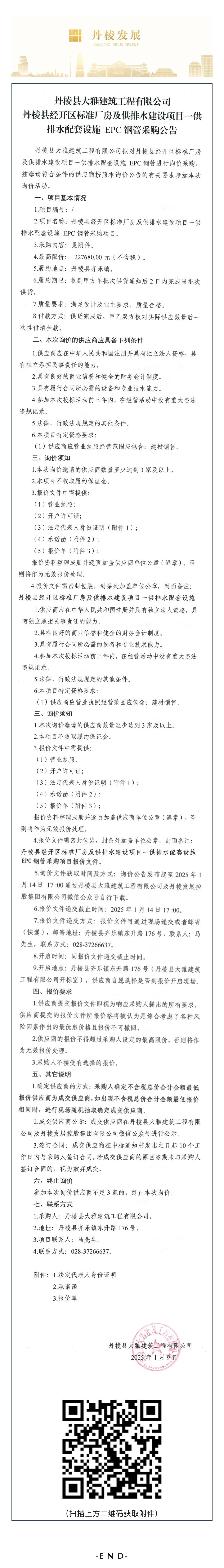 丹棱縣大雅建筑工程有限公司丹棱縣經(jīng)開區(qū)標(biāo)準(zhǔn)廠房及供排水建設(shè)項目一供排水配套設(shè)施 EPC鋼管采購公告
