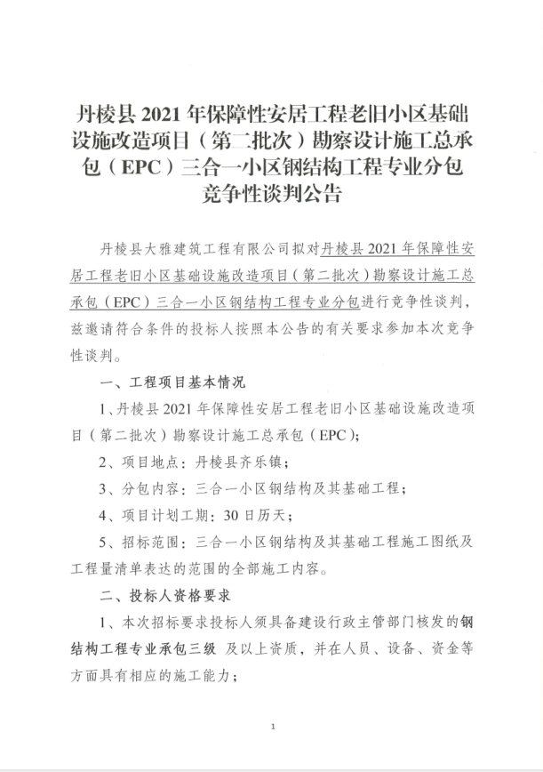 【大雅建筑公司】丹棱縣2021年保障性安居工程老舊小區(qū)基礎(chǔ)設(shè)施改造項目(第二批次)勘察設(shè)計施工總承包(EPC)三合一小區(qū)鋼結(jié)構(gòu)工程專業(yè)分包競爭性談判公告