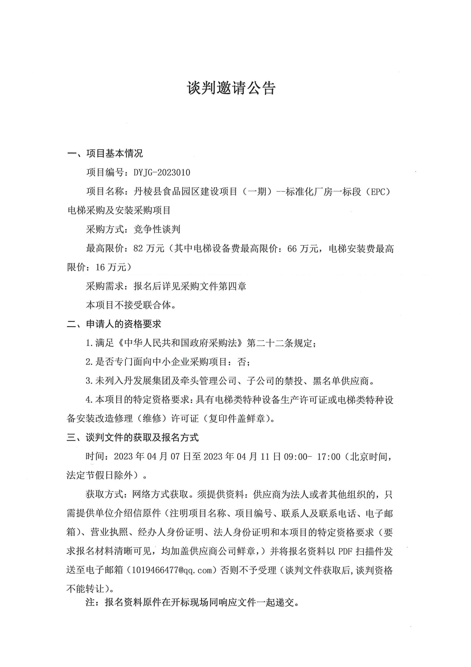 丹棱縣食品園區(qū)建設(shè)項目(一期)--標(biāo)準(zhǔn)化廠房一標(biāo)段(EPC)電梯采購及安裝采購項目談判邀請公告