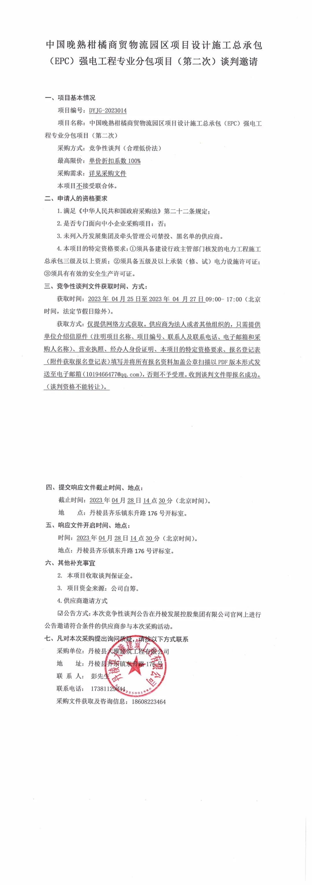 中國(guó)晚熟柑橘商貿(mào)物流園區(qū)項(xiàng)目設(shè)計(jì)施工總承包(EPC)強(qiáng)電工程專業(yè)分包項(xiàng)目(第二次)競(jìng)爭(zhēng)性談判邀請(qǐng)