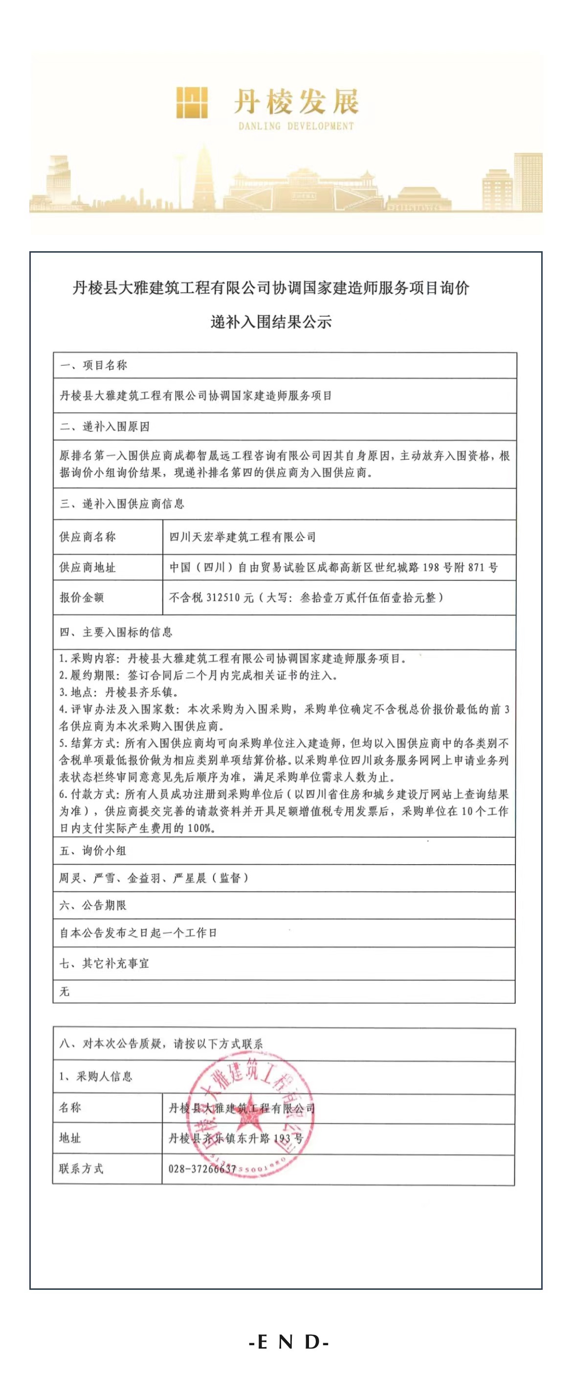 丹棱縣大雅建筑工程有限公司協(xié)調(diào)國家建造師服務(wù)項目詢價遞補入圍結(jié)果公示