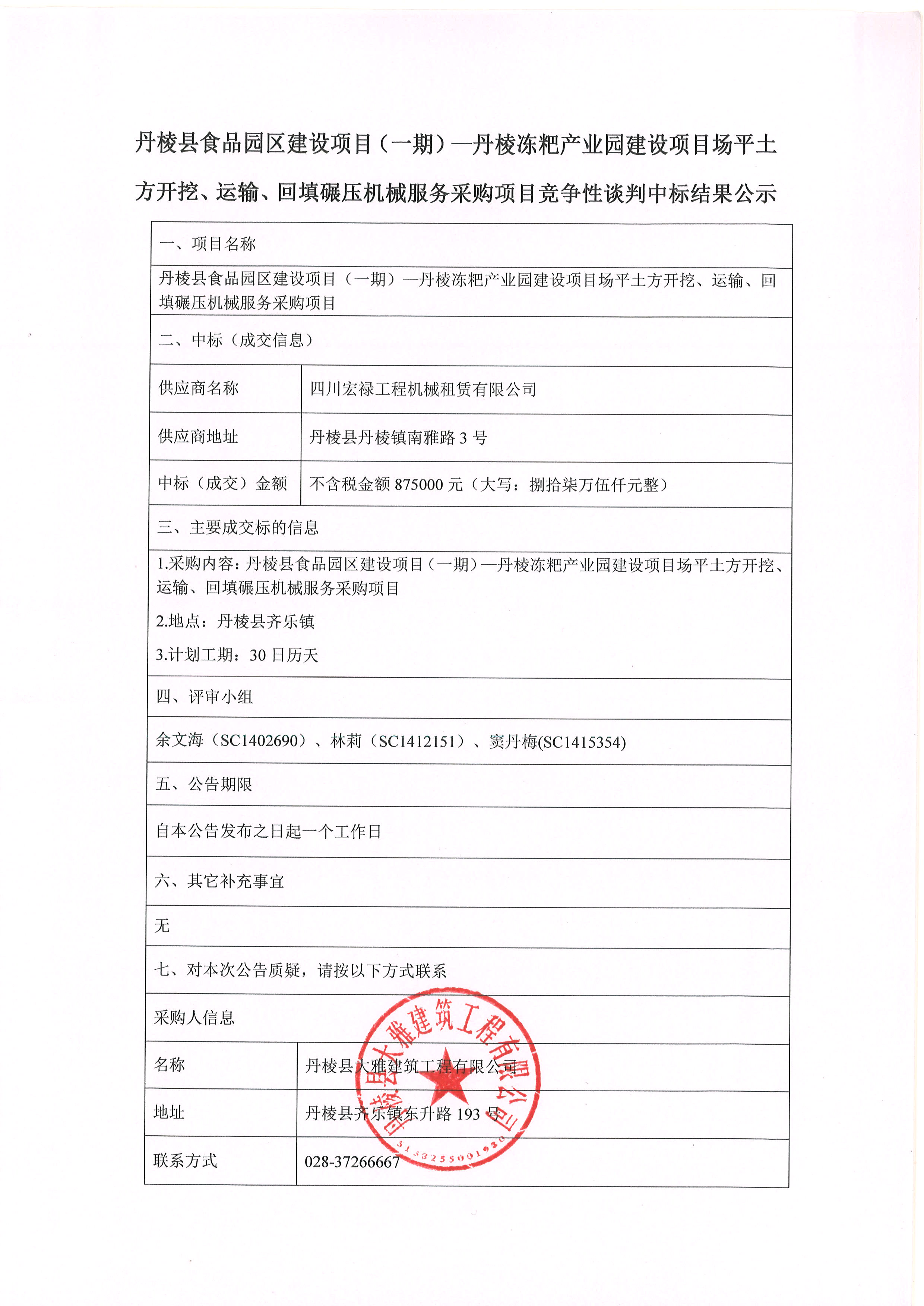 丹棱縣食品園區(qū)建設(shè)項(xiàng)目(一期)-丹棱凍粑產(chǎn)業(yè)園建設(shè)項(xiàng)目場(chǎng)平土 方開(kāi)挖、運(yùn)輸、回填碾壓機(jī)械服務(wù)采購(gòu)項(xiàng)目競(jìng)爭(zhēng)性談判中標(biāo)結(jié)果公示