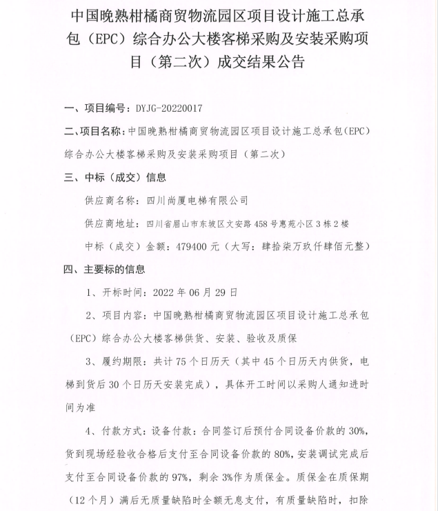 中國晚熟柑橘商貿物流園區(qū)項目設計施工總承包(EPC)綜合辦公大樓客梯采購及安裝采購項目(第二次)成交結果公告