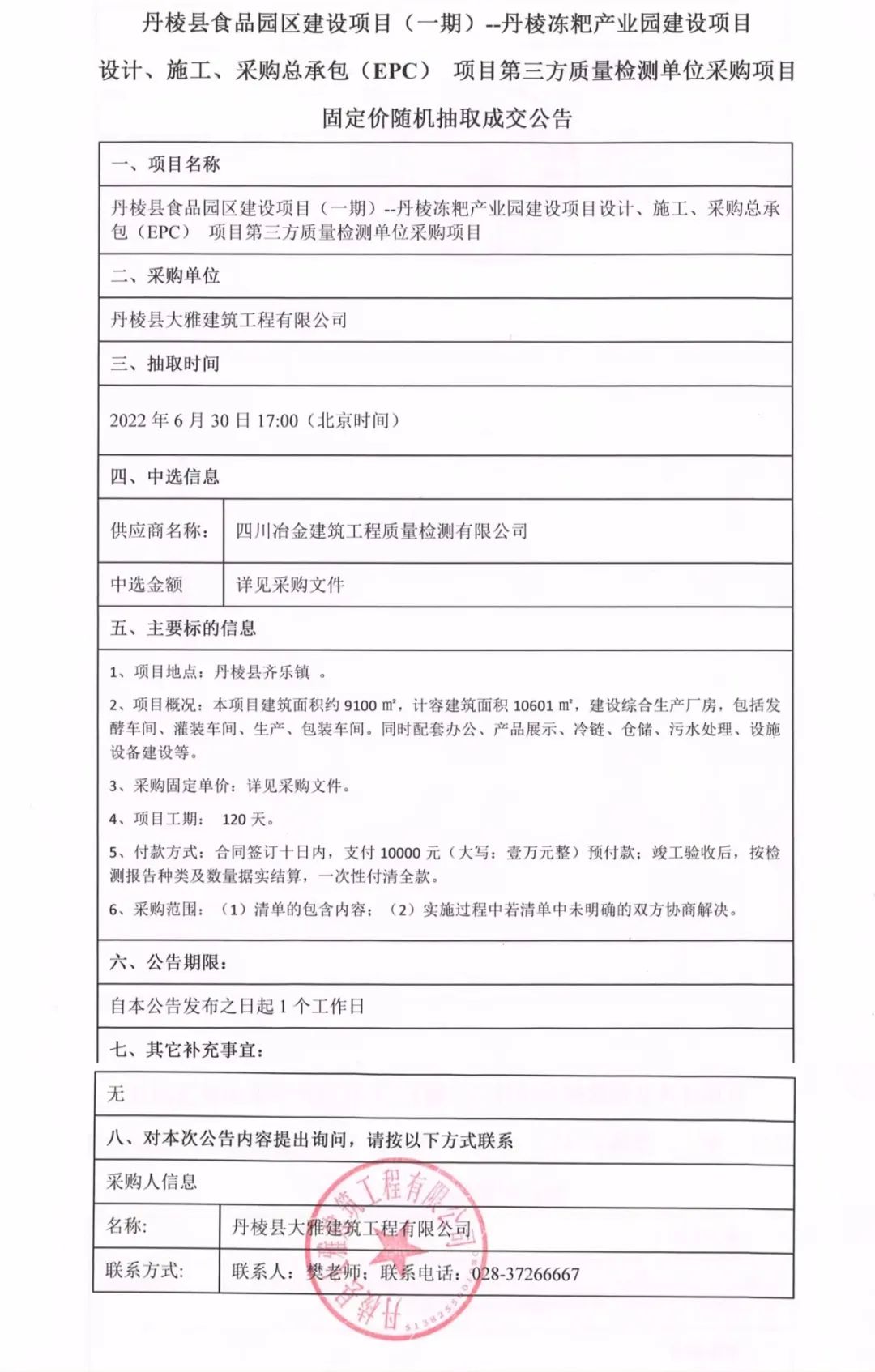 丹棱凍粑產(chǎn)業(yè)園建設(shè)項(xiàng)目設(shè)計(jì)、施工、采購(gòu)總承包(EPC)項(xiàng)目第三方質(zhì)量檢測(cè)單位采購(gòu)項(xiàng)目固定價(jià)隨機(jī)抽取成交公告