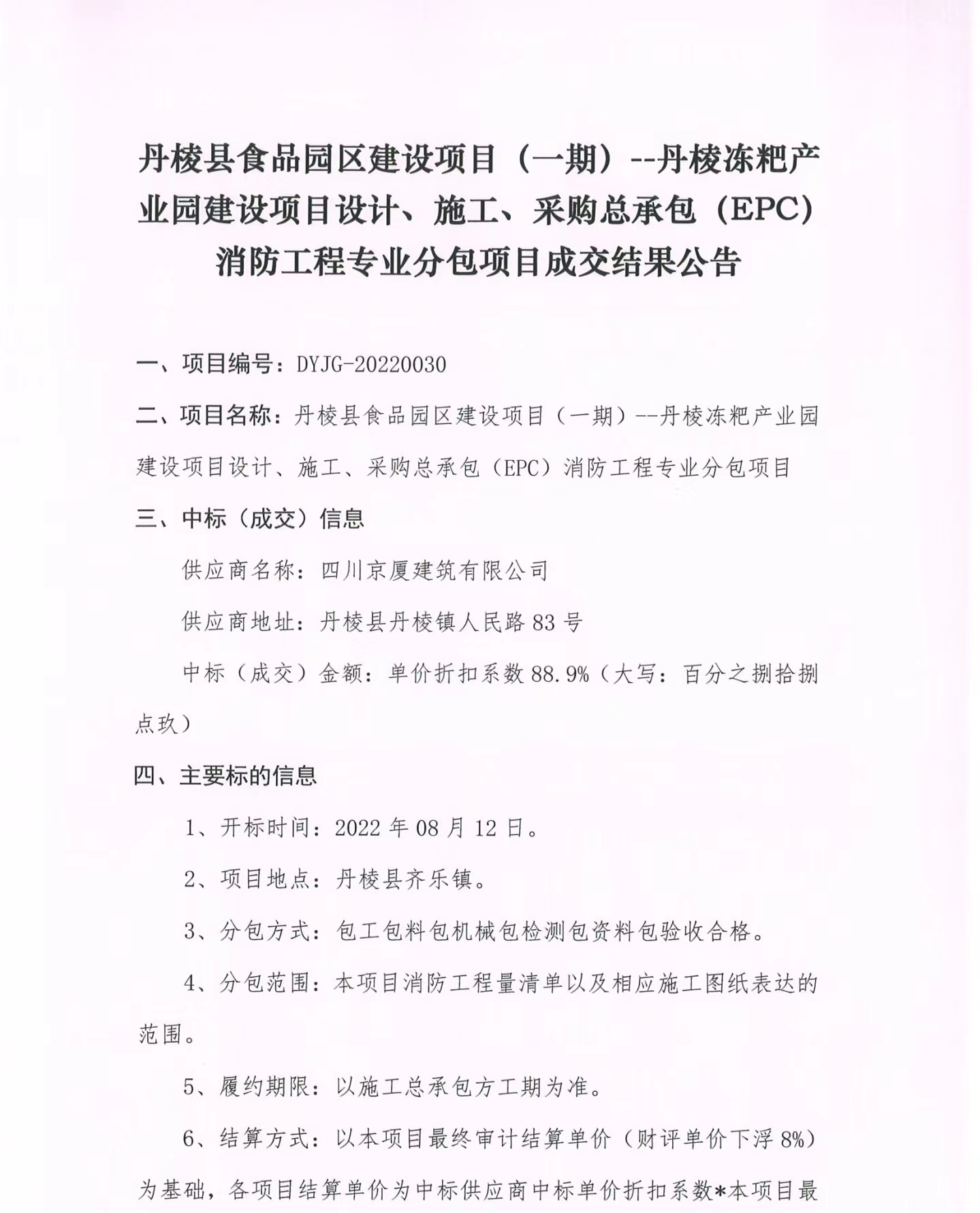 丹棱縣食品園區(qū)建設(shè)項(xiàng)目(一期)--丹棱凍粑產(chǎn)業(yè)園建設(shè)項(xiàng)目設(shè)計(jì)、施工、采購(gòu)總承包(EPC)消防工程專業(yè)分包項(xiàng)目成交結(jié)果公告