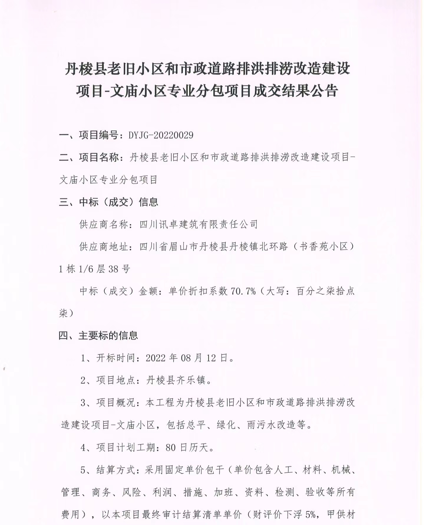 丹棱縣老舊小區(qū)和市政道路排洪排澇改造建設(shè)項目-文廟小區(qū)專業(yè)分包項目成交結(jié)果公告