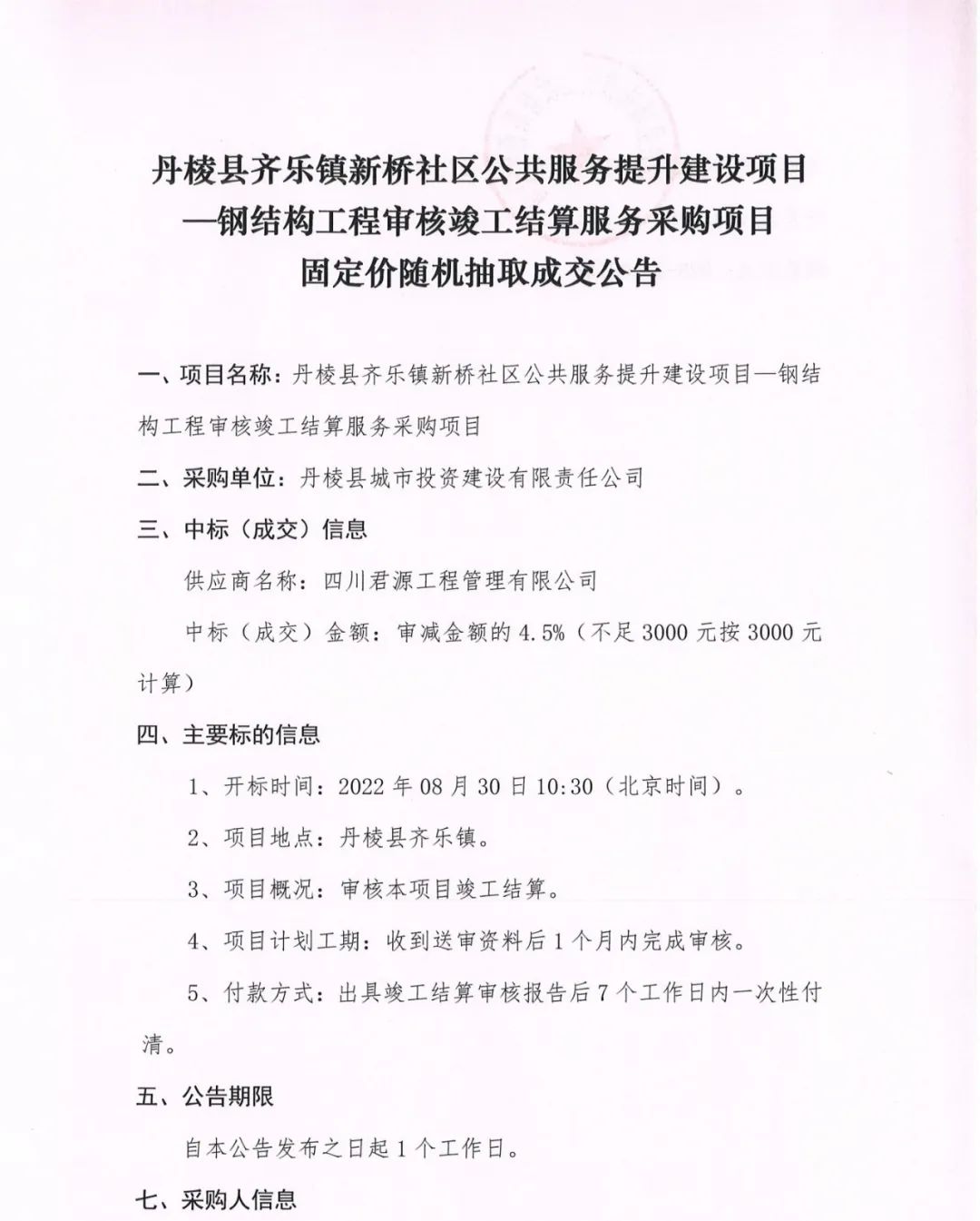丹棱縣齊樂鎮(zhèn)新橋社區(qū)公共服務(wù)提升建設(shè)項目--鋼結(jié)構(gòu)工程審核竣工結(jié)算服務(wù)采購項目固定價隨機(jī)抽取成交公告