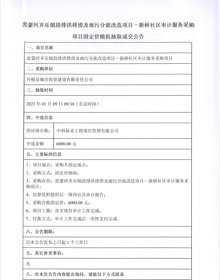 思蒙河齊樂鎮(zhèn)段排洪排澇及雨污分流改造項目--新橋社區(qū)審計服務采購項目固定價隨機抽取成交公告