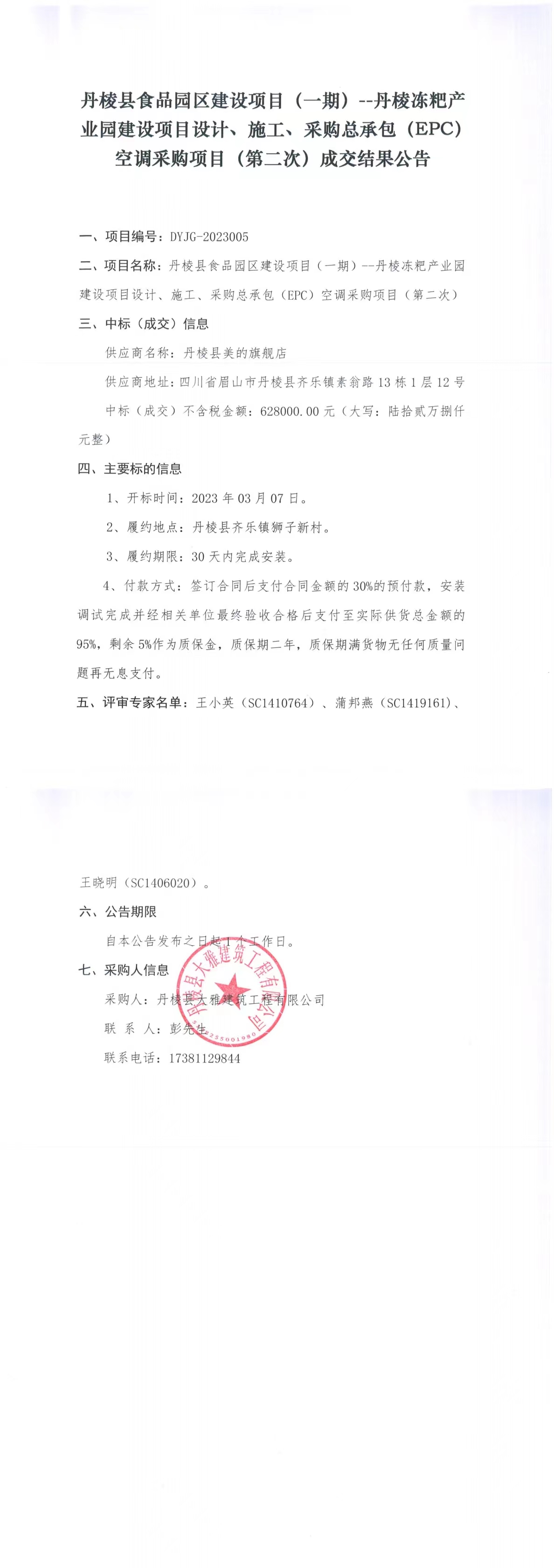 丹棱縣食品園區(qū)建設(shè)項目(一期)--丹棱凍粑產(chǎn)業(yè)園建設(shè)項目設(shè)計、施工、采購總承包(EPC)空調(diào)采購項目(第二次)成交結(jié)果公告