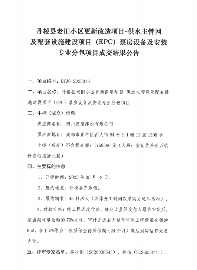丹棱縣老舊小區(qū)更新改造項目-供水主管網(wǎng)及配套設施建設項目(EPC)泵房設備及安裝專業(yè)分包項目成交結果公告