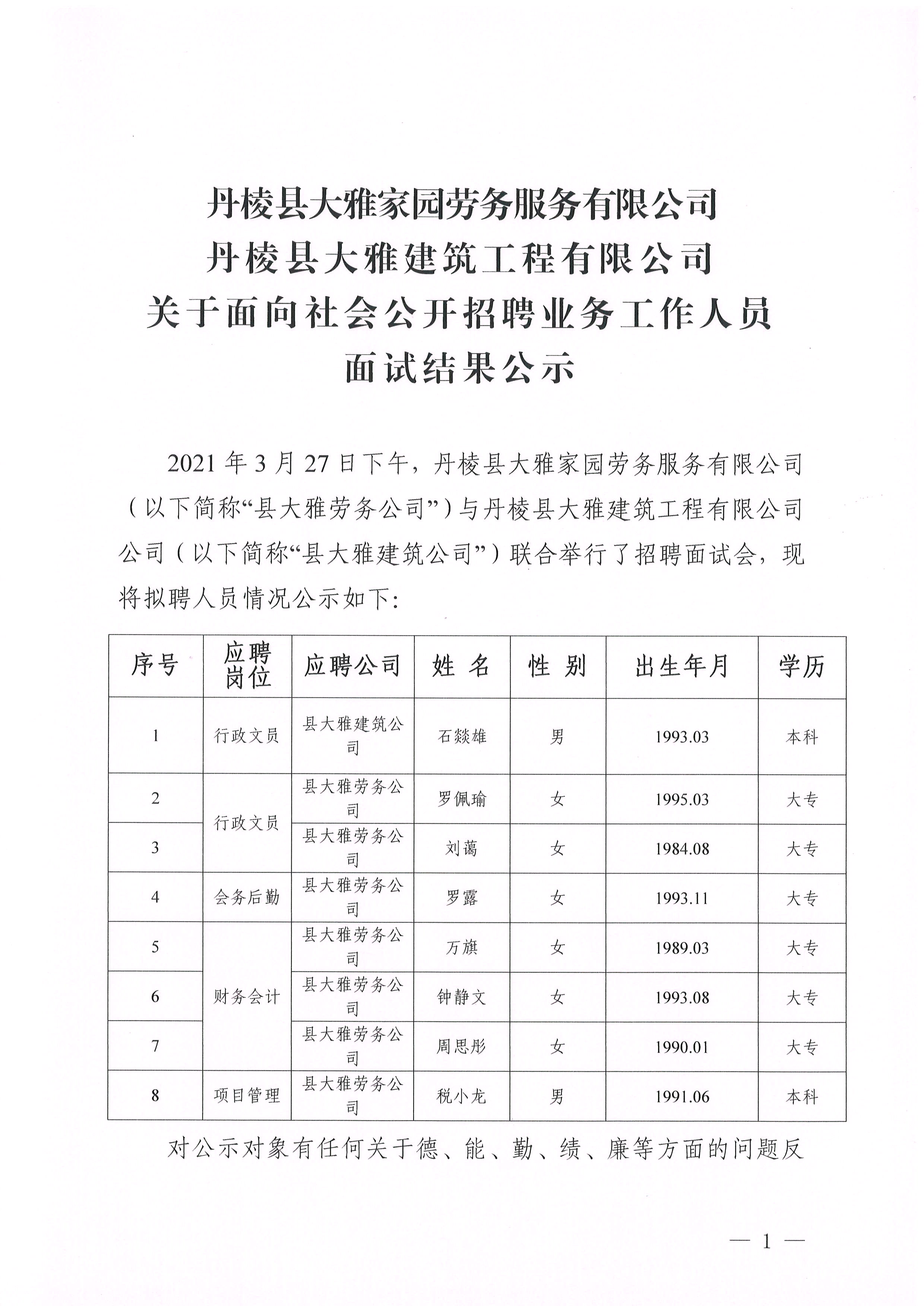 【大雅勞務(wù)公司】【大雅建筑公司】關(guān)于面向社會(huì)公開招聘業(yè)務(wù)工作人員 面試結(jié)果公示