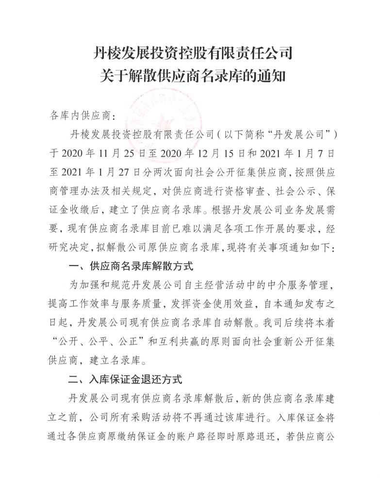 【丹發(fā)展公司】丹棱發(fā)展投資控股有限責(zé)任公司關(guān)于解散供應(yīng)商名錄庫(kù)的公告