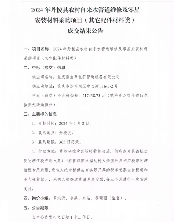 2024年丹棱縣農(nóng)村自來水管道維修及零星安裝材料采購項目 (其它配件材料類 )成交結果公告