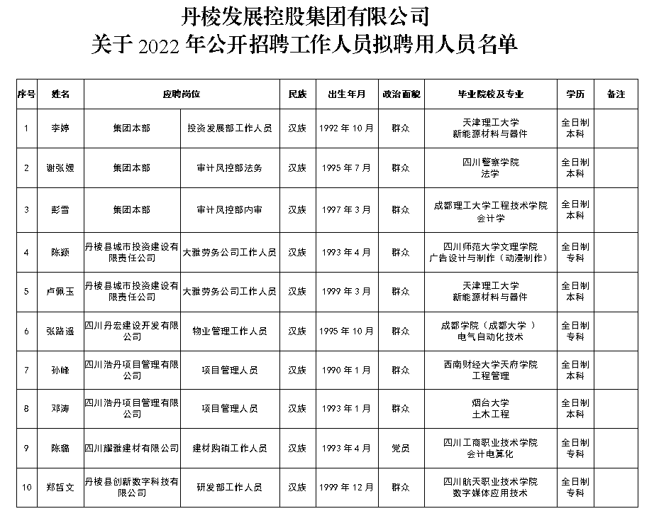附件:丹棱發(fā)展控股集團(tuán)有限公司關(guān)于2022年公開(kāi)招聘工作人員擬聘用人員名單
